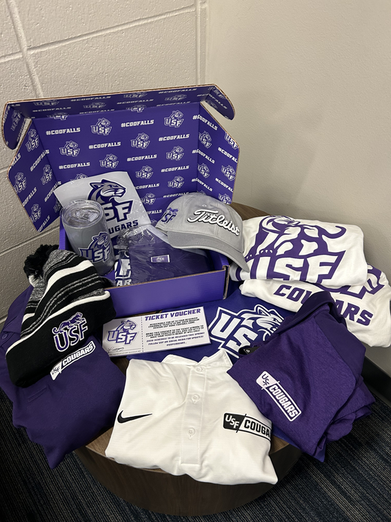 2 t-shirts, stocking hat, golf hat, tumbler, 2 string bags and USF flag